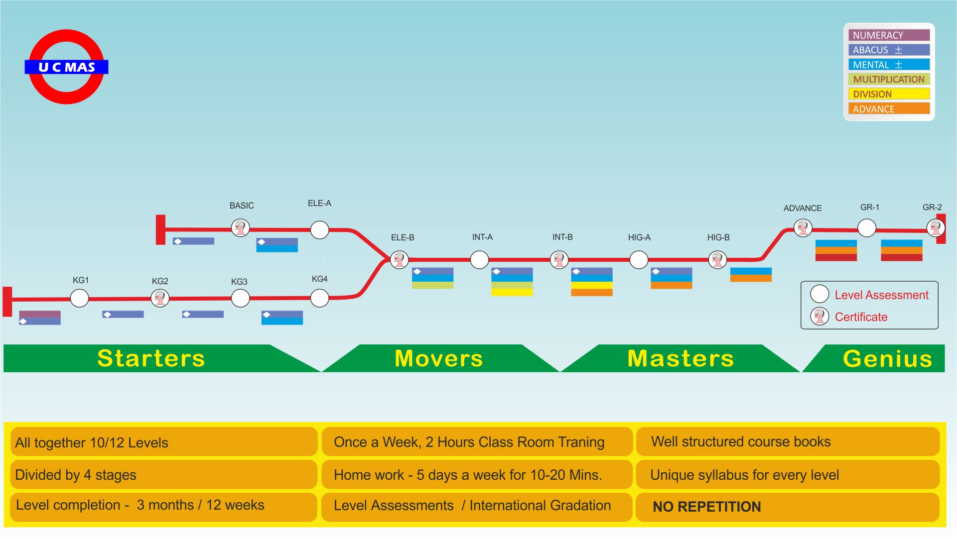 The advantage of U C MAS is that it is a whole brain development programme. The course not only helps children to master arithmetic skills but the training of Abacus helps in nurturing and balancing the multiple intelligence of human brain. Through our abacus training we develop lifetime skills such as concentration, creativity, visualisation, listening and photographic memory, which enables children to discover and bring out the hidden potentials in young minds.